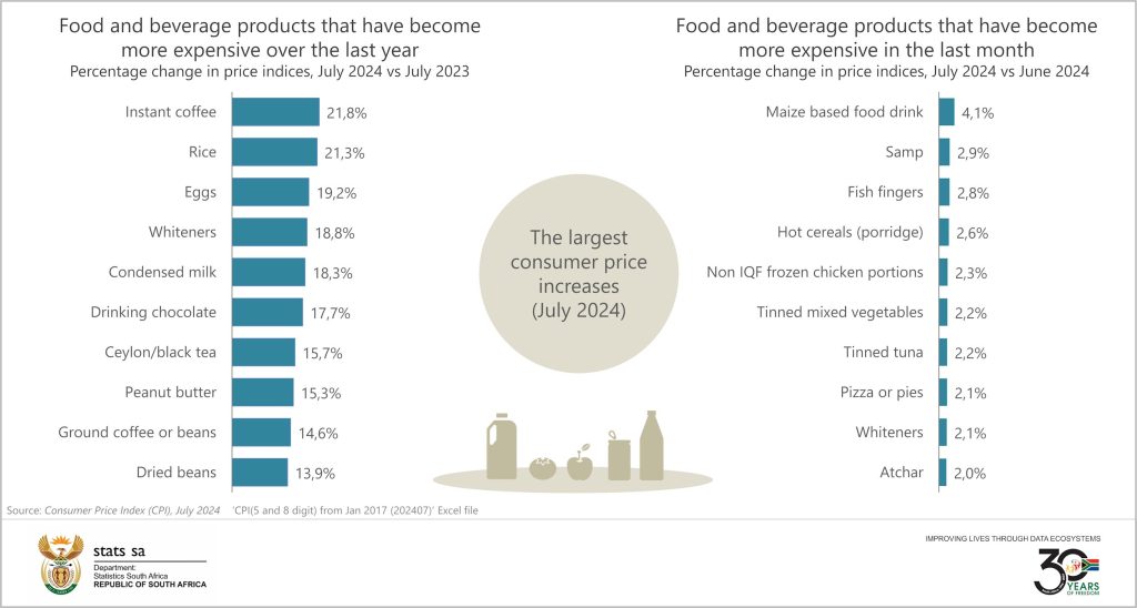 Hot beverages continue to witness high inflation rates. The price index for the category increased sharply by 17,6% in the 12 months to July, up from 16,5% recorded in June. Large annual price increases were recorded for instant coffee (up 21,8%), drinking chocolate (up 17,7%), black tea (up 15,7%), ground coffee and coffee beans (up 14,6%) and rooibos tea (up 11,1%). Cappuccino sachets recorded the lowest price increase in this category, rising by 7,6% over the same period.