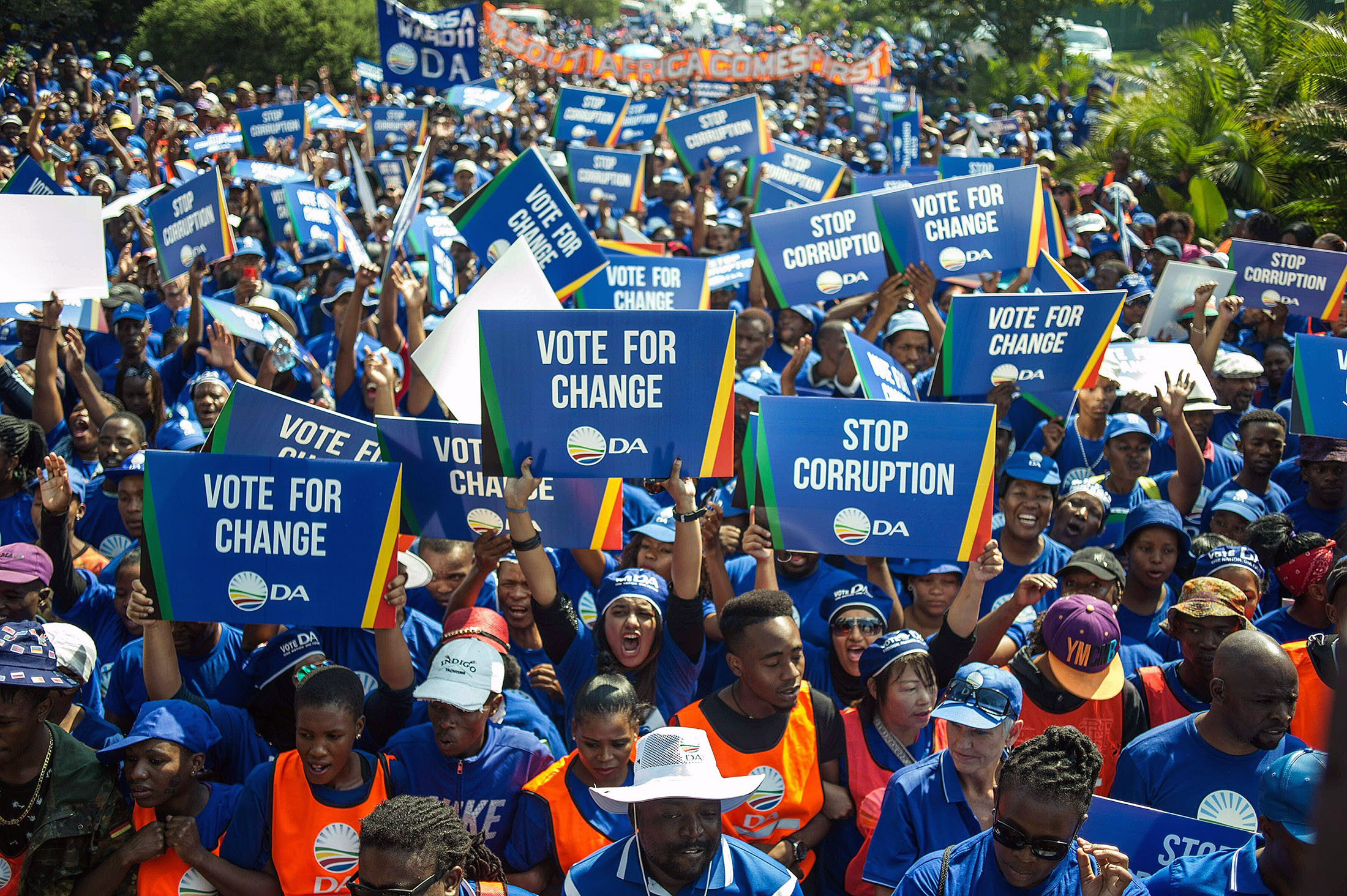 Thousands of South African main opposition party Democratic Alliance (DA) supporters march to the Constitutional Court to protest against South African President Jacob Zuma, on April 15, 2016 in Johannesburg. / AFP / MUJAHID SAFODIEN (Photo credit should read MUJAHID SAFODIEN/AFP/Getty Images)