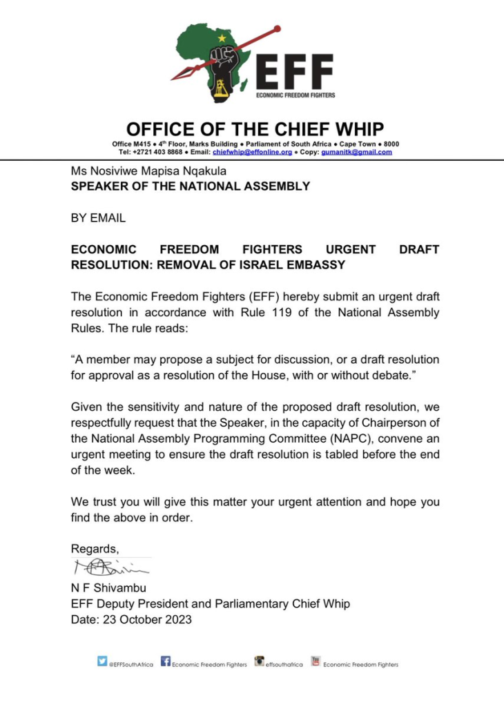 “Given the sensitivity and nature of the proposed draft resolution, we respectfully request that the Speaker, in the capacity of Chairperson of the National Assembly Programming Committee (NAPC), convene an urgent meeting to ensure the draft resolution is tabled before the end of the week”, said Shivambu in the letter to Speaker Nosiviwe Mapisa-Nqcakula.